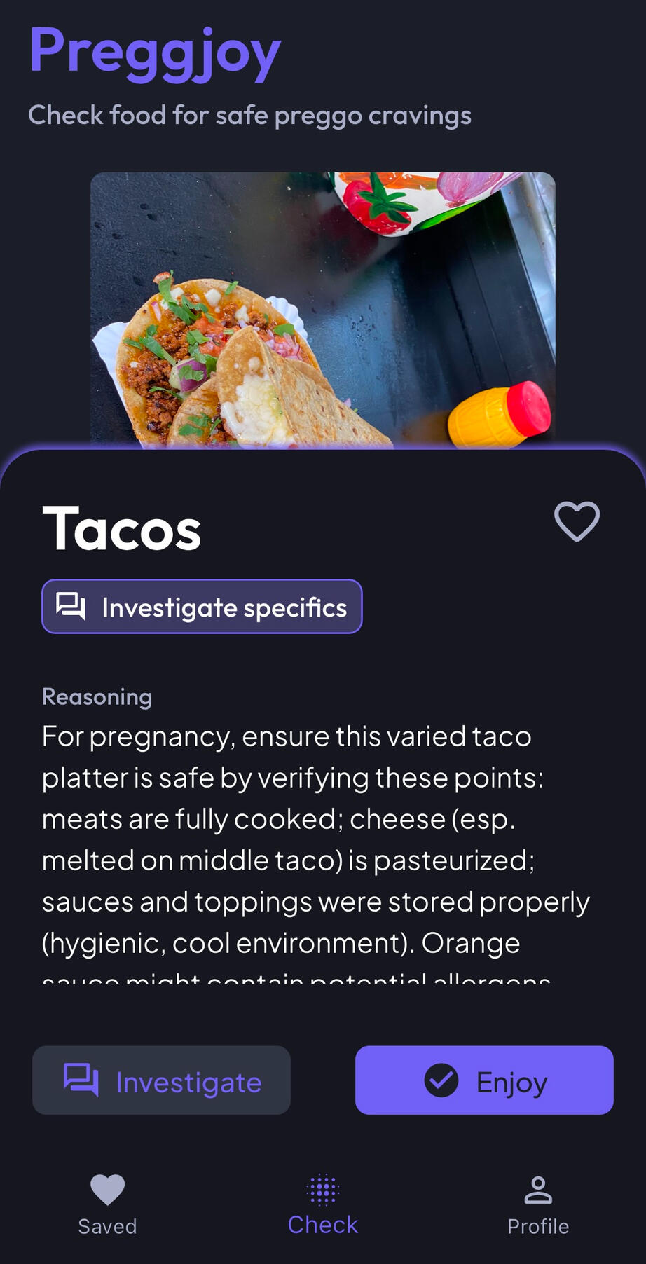 - The app runs an LLM that classifies food as “safe to consume,” “not recommended,” “requires more specific investigation,” “should be avoided,” or “discussed with doctor,” along with a brief explanation.